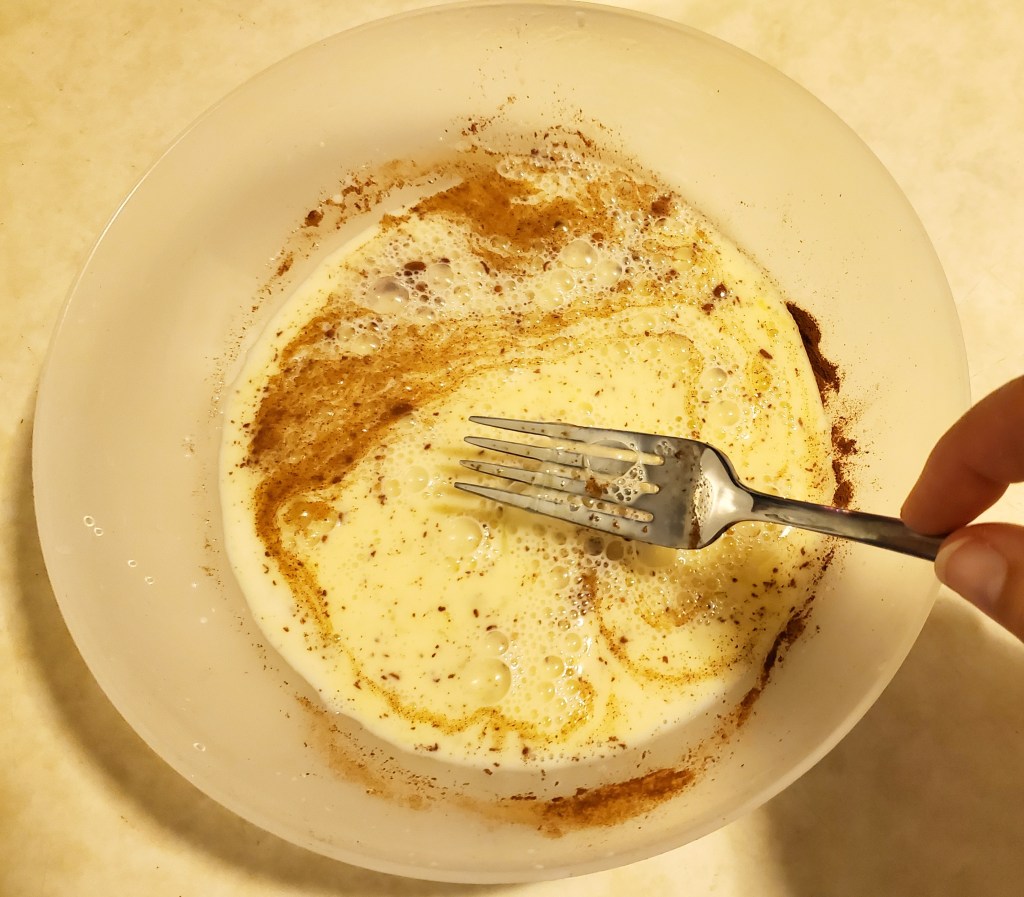 - Put egg, milk, cinnamon, and vanilla into a shallow bowl and whisk thoroughly with a fork.