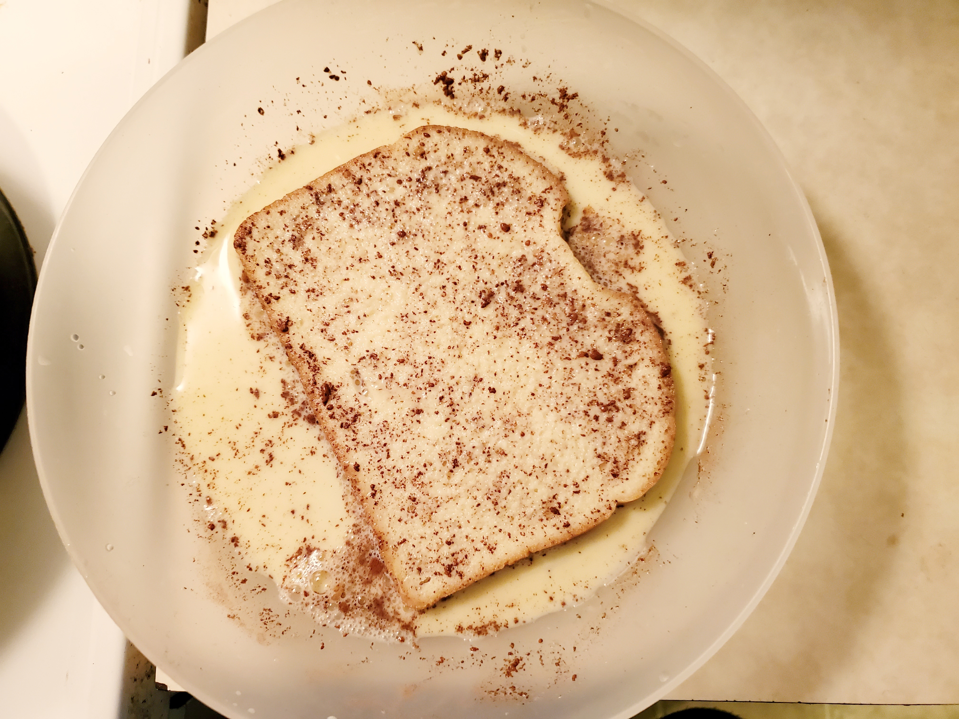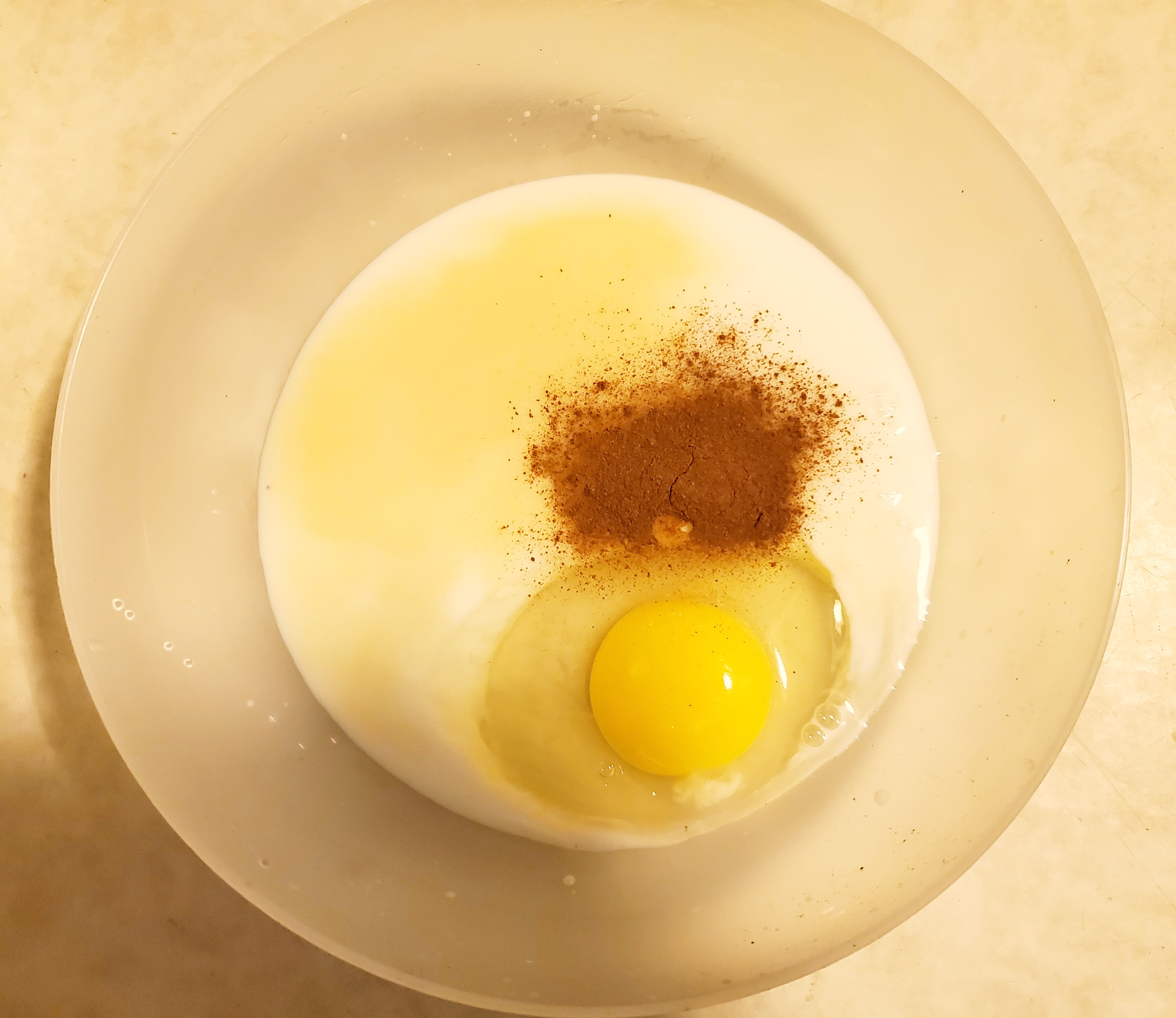 Okay, so you start off with super simple staples: egg, milk, vanilla extract, and cinnamon. Put all of these into a wide, shallow bowl or even a piece of Tupperware that’s big enough to fit your bread slices in, and isn’t terribly deep.