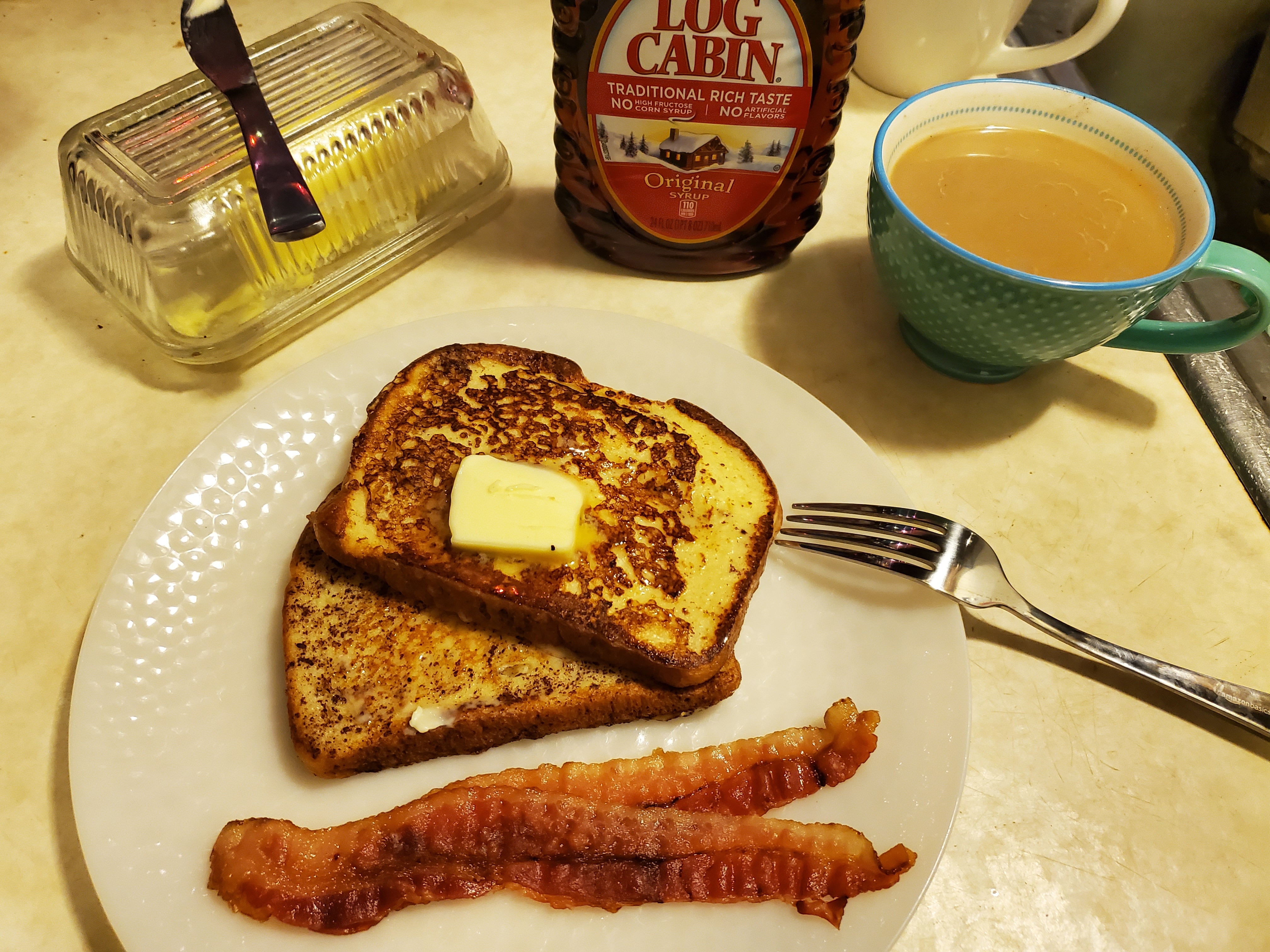This is my recipe for French toast for one. I find most recipes for breakfasts make enough for a family, but aren’t the easiest to pare down for only one or two people, unfortunately. But I think one day, many, many moons ago, I just decided to make French toast, but only wanted a couple of pieces, and sort of figured out the easiest way to do it!