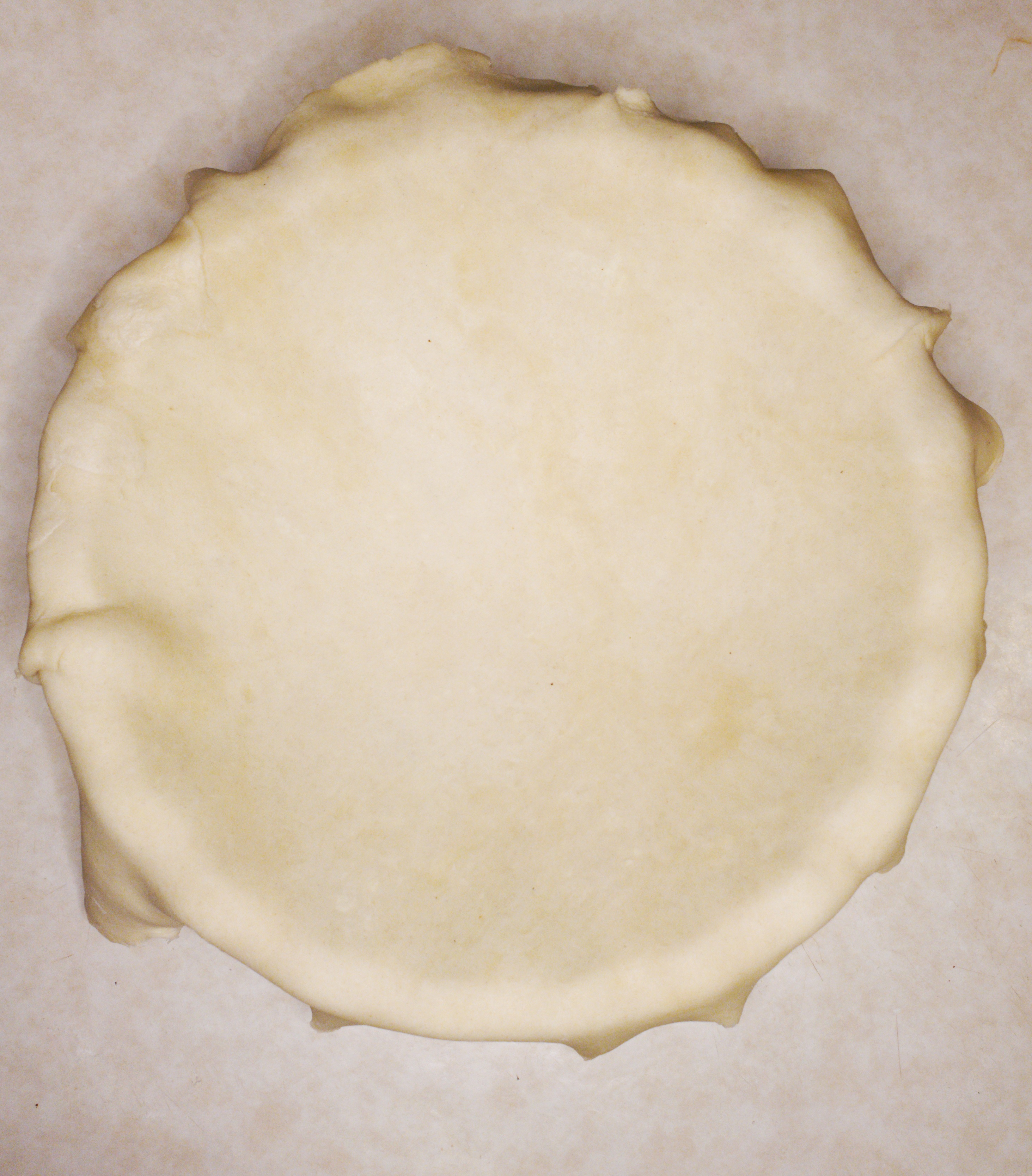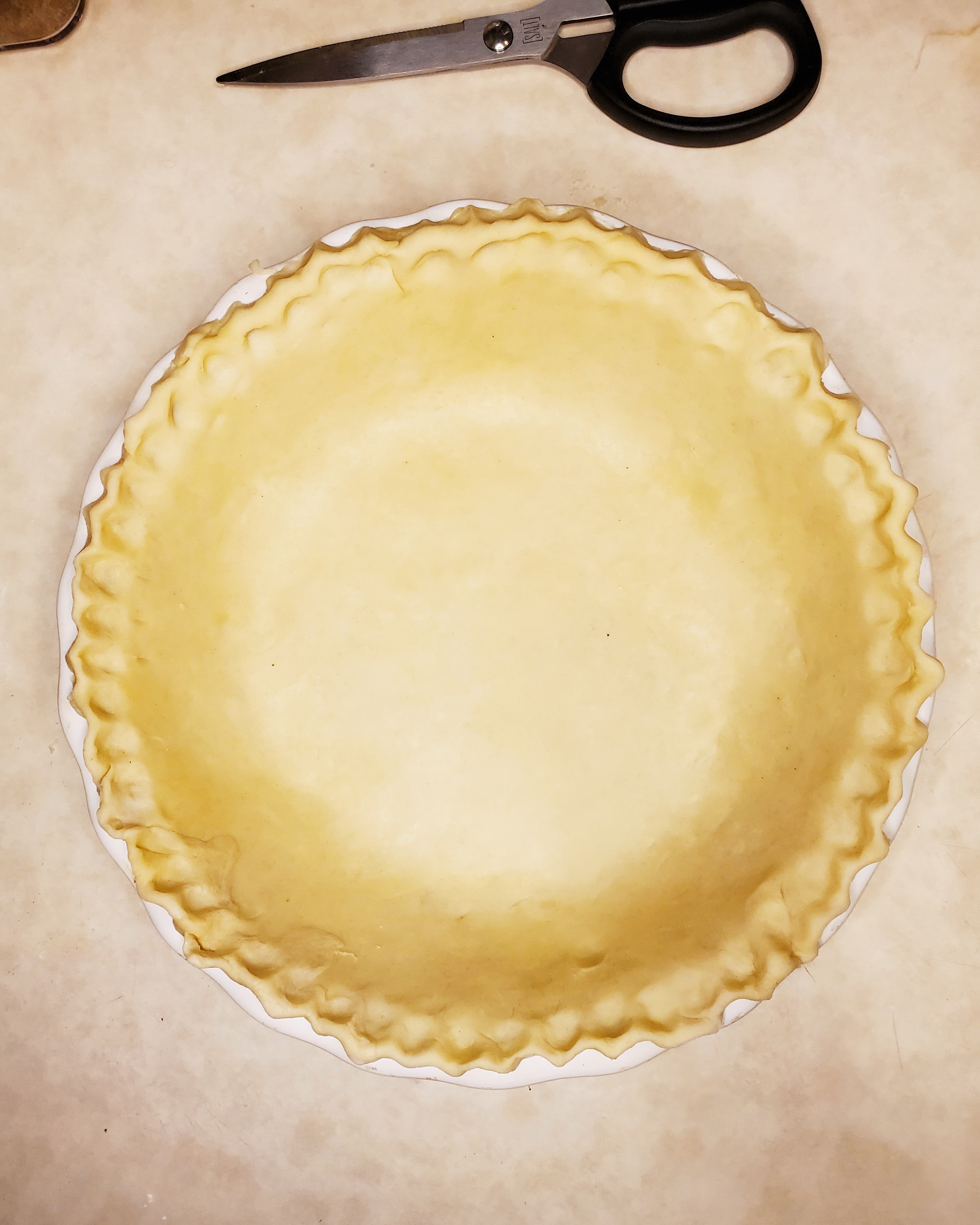 - Once you’re ready with the filling, roll out one disc until it’s about 1/4 inch thick. You may have to let the dough sit for a minute before rolling if it’s been chilling for longer. Gently, lift the crust and rest it over your rolling pin. Move crust into pie plate, adjusting it so it sits nicely in the angle of the bottom. Trim the excess with a knife or kitchen shears, and save for decoration, or use to patch holes.