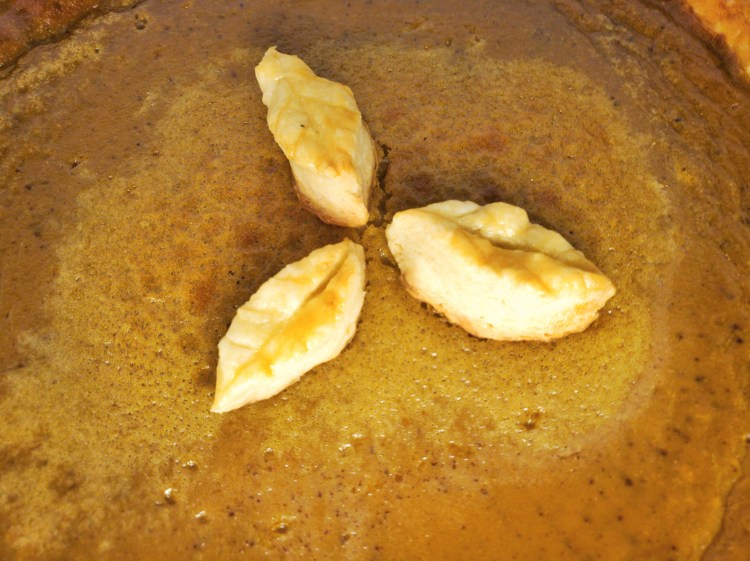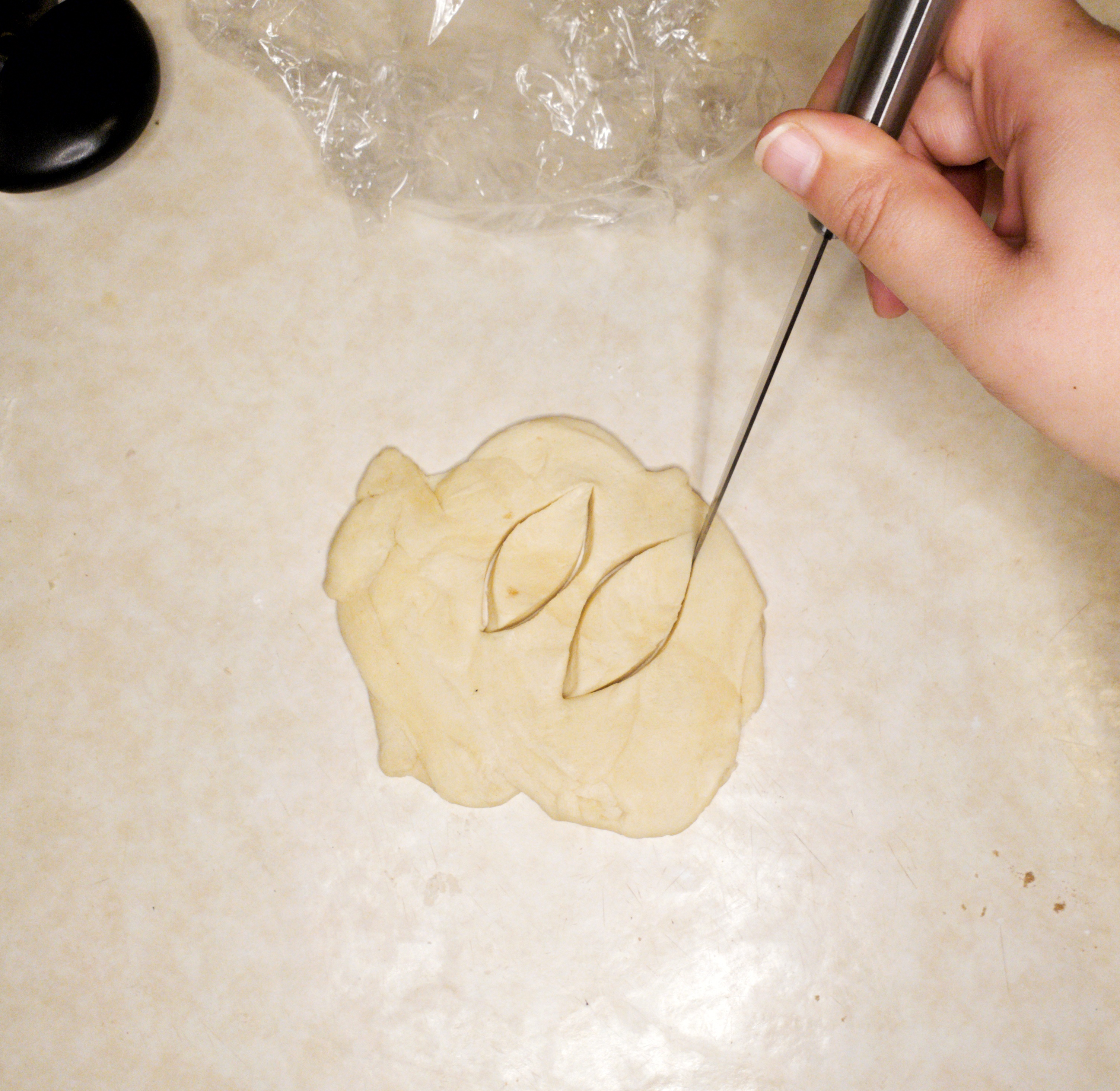 - When I made my leaf decorations, I didn’t place them on the filling while it baked – this is because the filling is quite liquidy before it cooks! So I baked those separately, and pulled them out when they were done, and added them to the pie afterward. If your pieces aren’t too big, you can probably add them to your crust without them sinking into the filling while it bakes.
