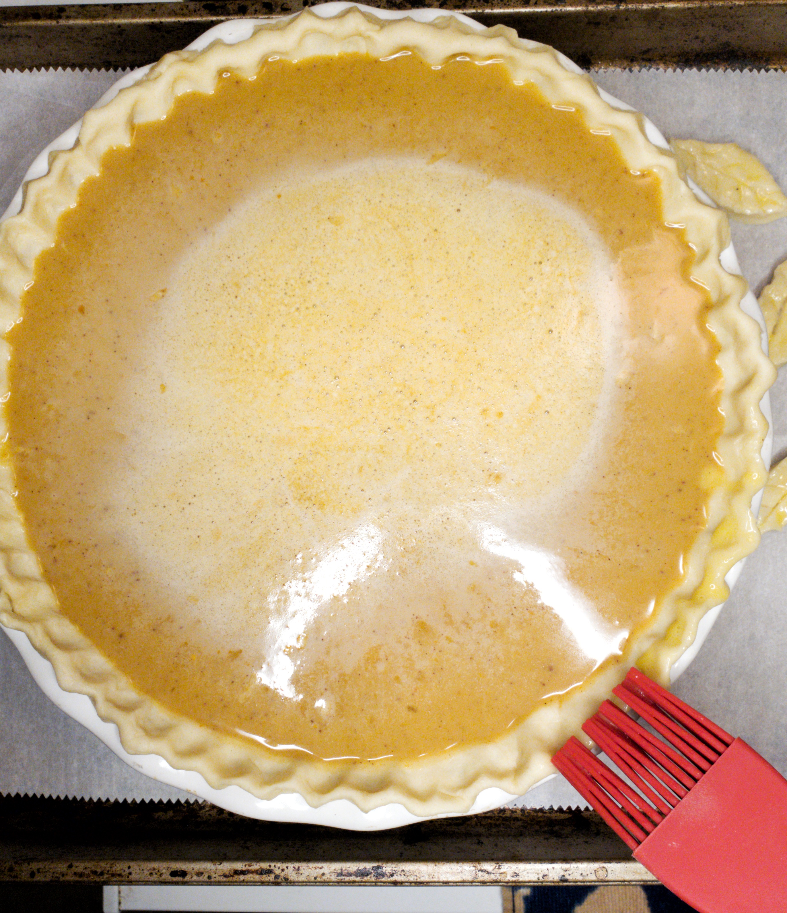 - Using a pastry brush, brush beaten egg onto edge of crust, and on any other decorative elements.