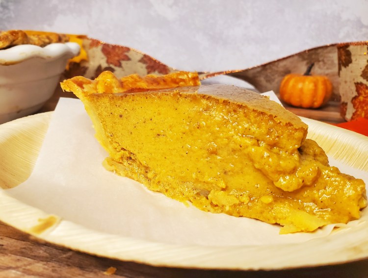 - My 9″ deep dish pie plate is VERY DEEP. Even though it measures the same as any other deep dish pan out there, I always have issues with deep dish pie fillings not being quite enough. Like, even with this recipe, I had to make another batch of the filling to fill it properly, and used the remainder to make another smaller pie. However, it does fill it enough, so if you’re okay with a little extra crust at the top, or if your pie plate is not as deep, you should be fine. This should make two smaller pies if you have non-deep dish pie plates. I have yet to take the time to figure out how to make this filling in one bigger portion to fully fit my pie plate, since just using a bigger can of puree will change the texture and flavor profile a bit.