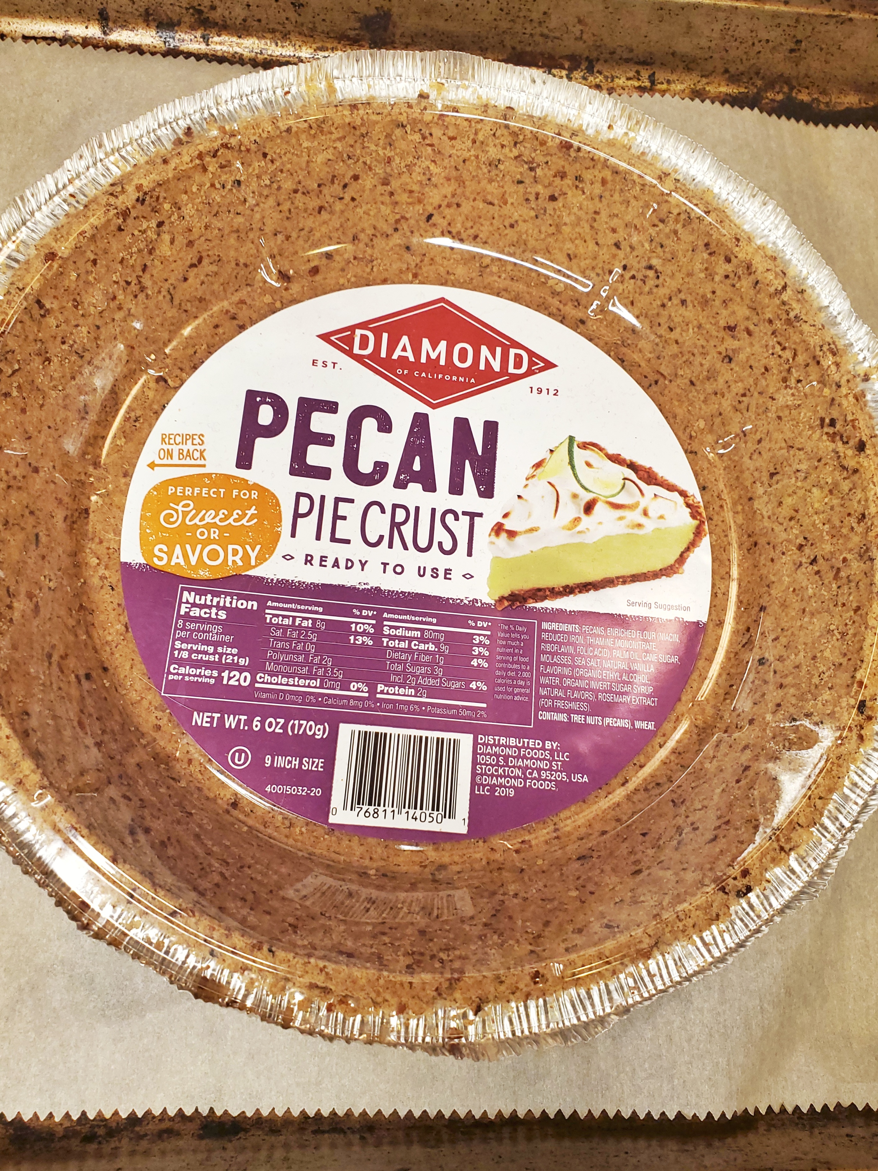 I also used this cool pecan crust I found at the store, and I thought it added a pretty interesting pecan-y crunch and flavor to the final product. They also have a walnut crust. I think I’ll try them again with something like a quiche or another sweet pie! It also was the perfect size to put the remaining filling that didn’t fit in the deep dish plate.