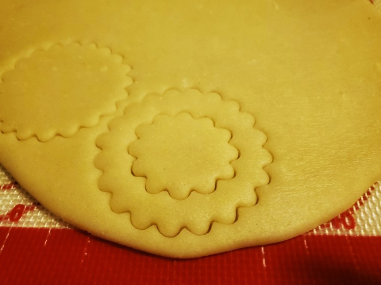 - To make the tops of the cookies, use cookie cutters to cut the same size as the base, and then cut the center out of them to create a “wreath” like top. Using a spatula, transfer tops to the prepared cookie bases, nudging them into place gently with your fingertips.