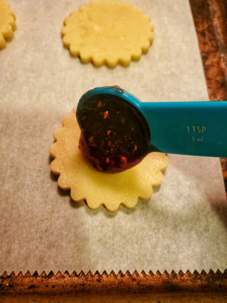 - Using a teaspoon or a small spoon, place dollops of jam in the center of the bases. Use the back of the spoon to gently push the jam out, leaving a 1/4″ border.