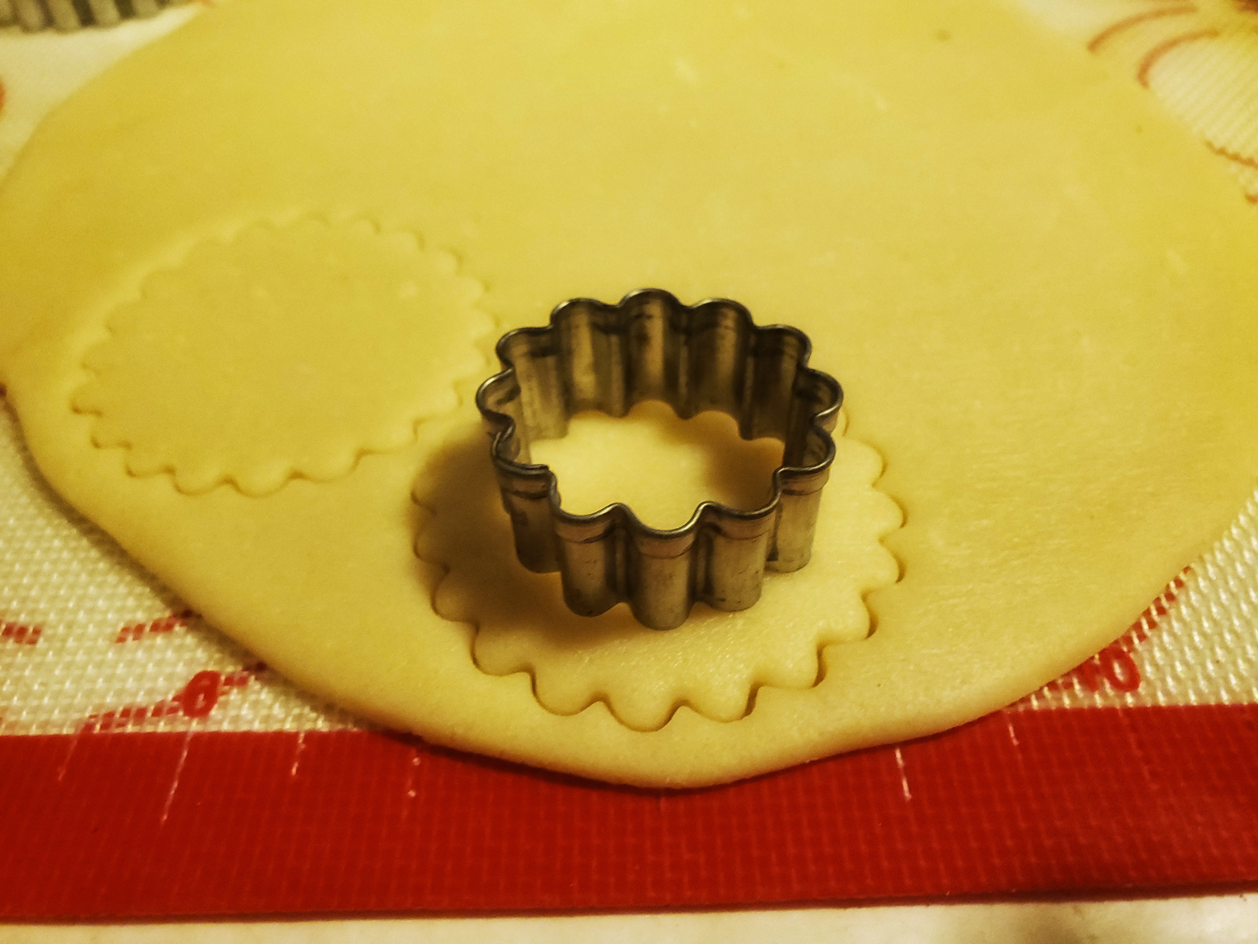 - To make the tops of the cookies, use cookie cutters to cut the same size as the base, and then cut the center out of them to create a “wreath” like top. Using a spatula, transfer tops to the prepared cookie bases, nudging them into place gently with your fingertips.
