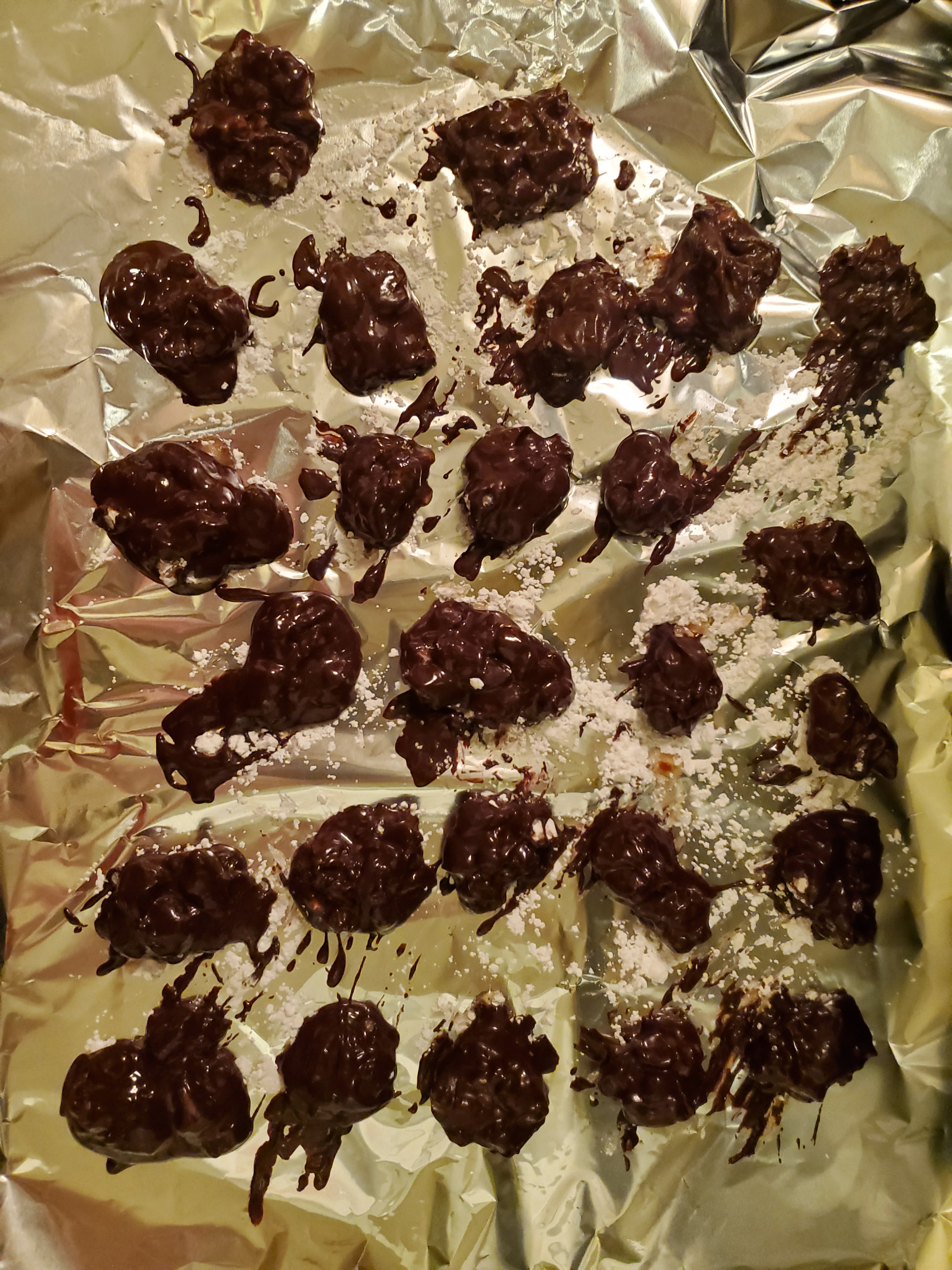 Unfortunately, it didn’t turn out quite how I wanted it. I wanted to make crunchy clusters of nuts, with a drizzle of dark chocolate. What I got was something that was, even after putting it in the freezer overnight, a sticky mess. =/ They still taste good, though! But because I must have messed up the amount of corn syrup in the recipe, they never really hardened. So I rolled them in a powdered sugar, to keep them from being too sticky, then dipped them in melted dark chocolate. Probably not as healthy as I was hoping, but they’ll make a crunchy sweet treat, anyhow. I think next time, I’ll just use sugar, and melt it, and hope it doesn’t crystalize while I’m making them. :D